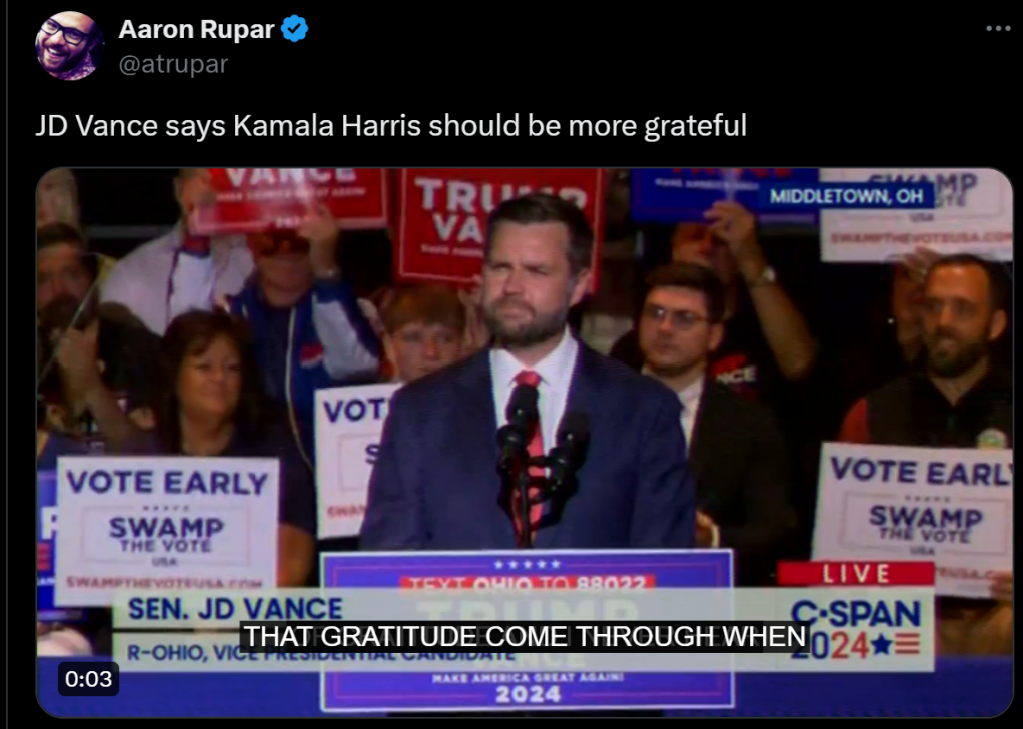 Dispense with garbage that black people and immigrants are ungrateful. JD Vance plays to his audience’s self-superiority by positing that he’s grateful to his country, and that you have a responsibility to give back. In 2019, Kamala Harris literally started her campaign talking about how much she loves this country, and how she feels a responsibility to give back. JD Vance just isn’t listening. Instead, he’s stirring up anti-immigrant, anti-black sentiment towards “ungrateful” freeloaders who do nothing for their paychecks. Our work as white people in this campaign it to call it out.