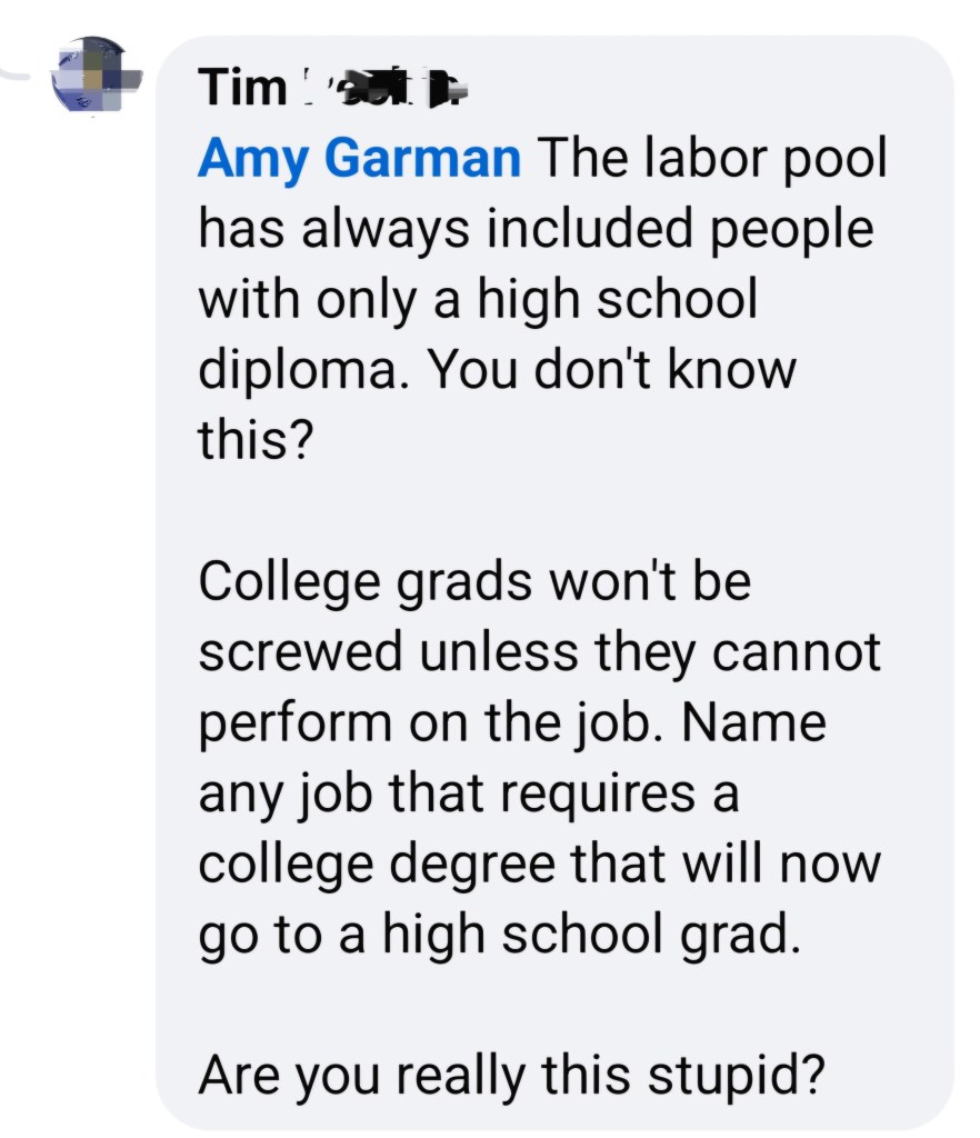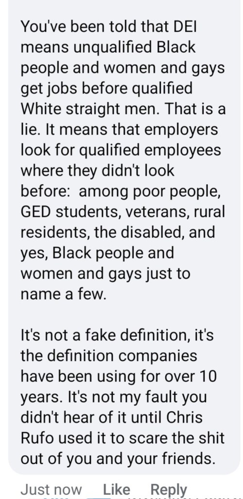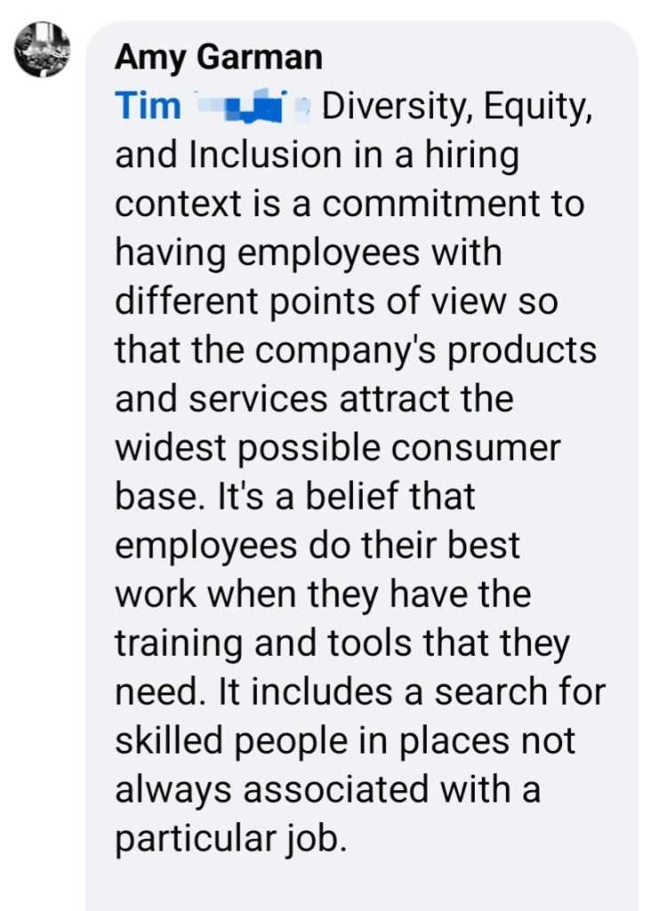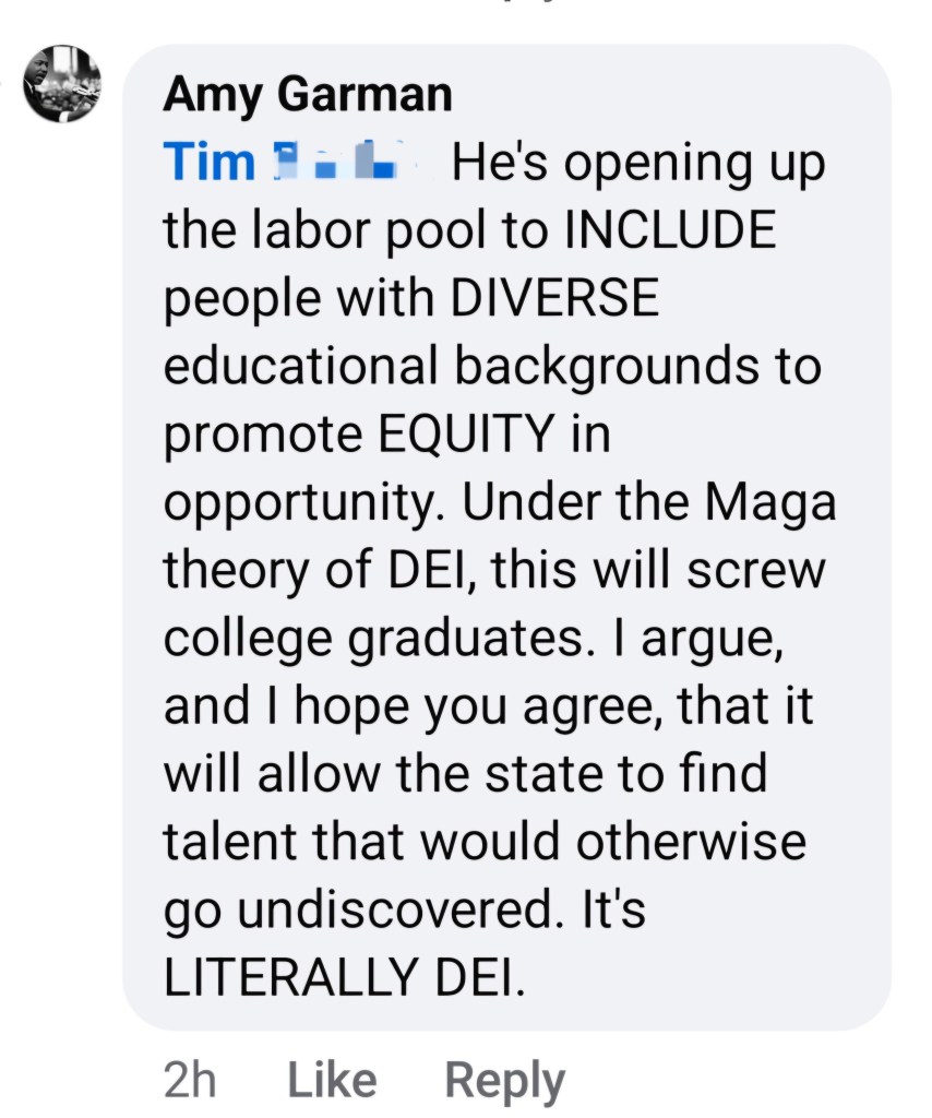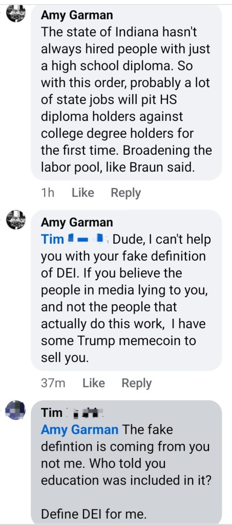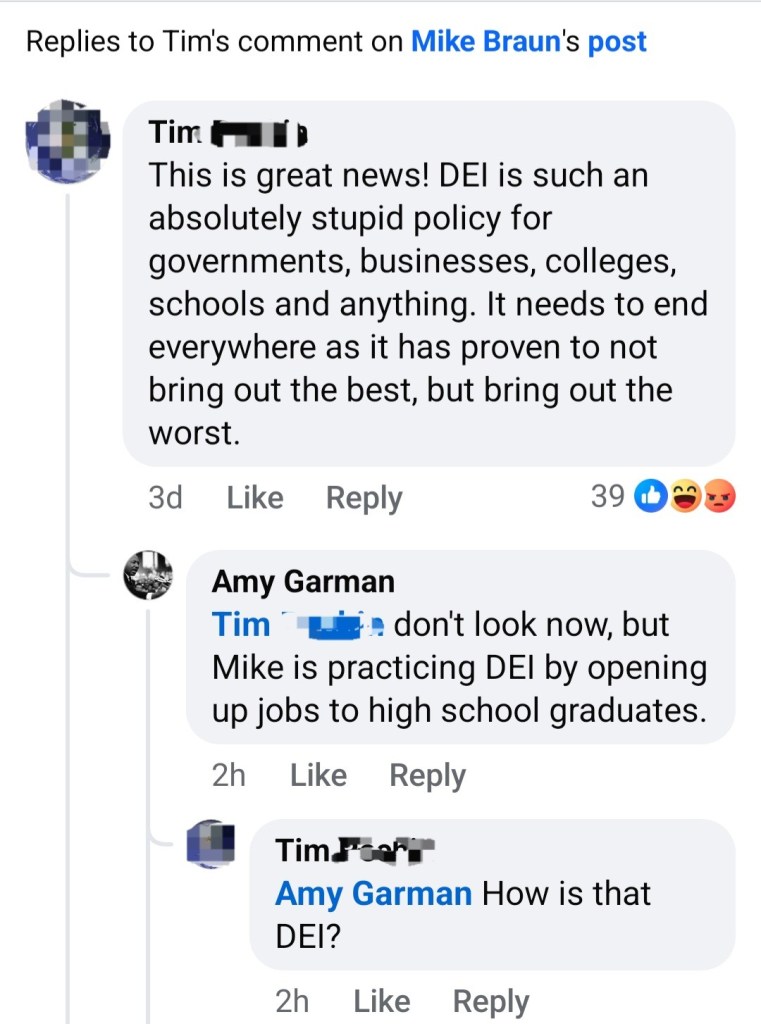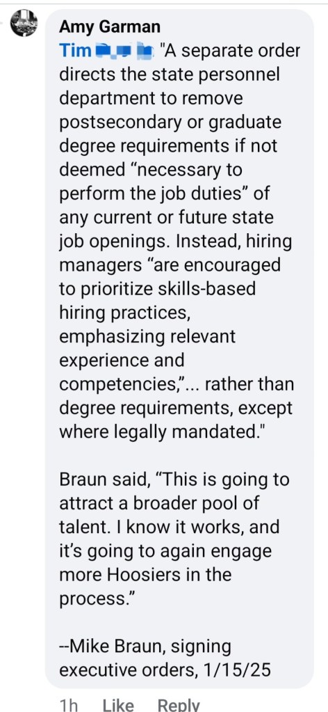 Such was the case when my new Governor, Mike Braun, posted on Facebook about his plans for, among other things, dismantling Indiana’s DEI efforts. A few days earlier, I had read about Braun’s policy to remove hiring restrictions that required a college degree for positions where a degree wasn’t legally mandated. Not a bad idea, really, when it comes to finding talented employees that have the skills for a job, but for whatever reason, don’t have the necessary credentials. Ironically, that’s fundamental DEI: removing barriers to productive employment and advancement. I filed that away for later use, and darn if “Tim” didn’t give me my shot.